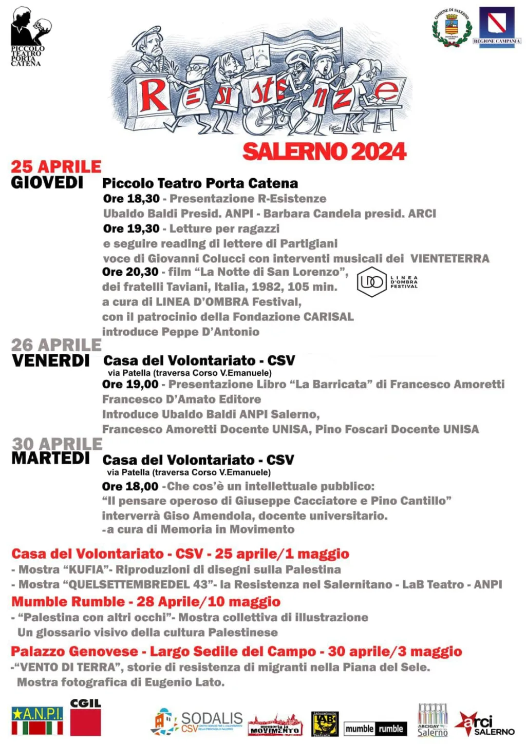 La proiezione del film La notte di San Lorenzo dei fratelli Taviani, nel giorno dell’anniversario della liberazione d’Italia, giovedì 25 aprile, è l’evento più significativo della giornata inaugurale della nona edizione di R-Esistenze, manifestazione di carattere storico culturale su temi di carattere sociale, civile e sui diritti. In programma dal 25 aprile al 10 maggio 2024 la manifestazione gode del patrocinio del Comune di Salerno e della Regione Campania organizzata da ANPI Salerno, Piccolo Teatro Porta Catena, Lab Teatro, Sodalis, Memoria in Movimento, Mumble Rumble, Arcigay Salerno, Arci Salerno, CGIL Salerno.