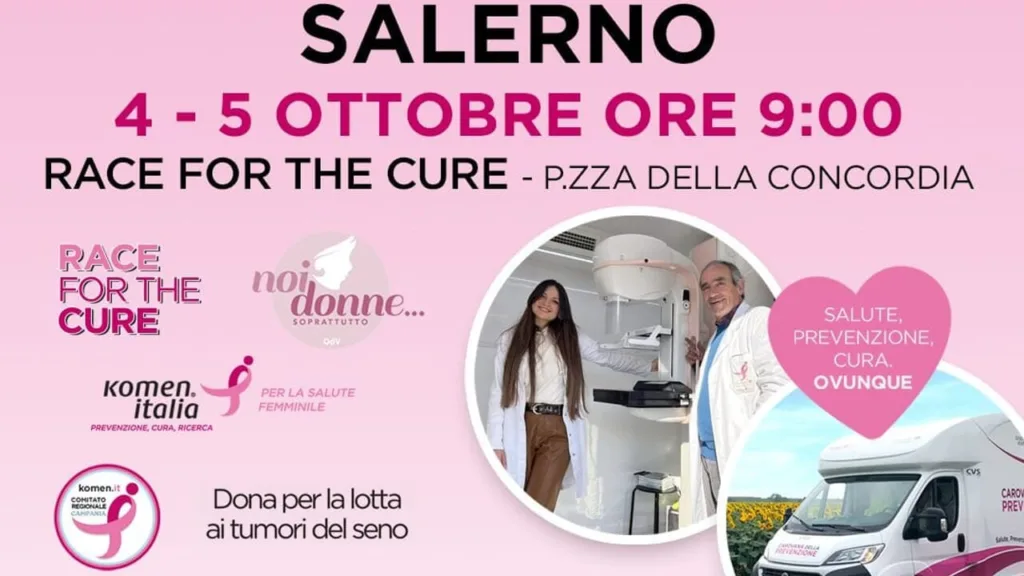 Per il terzo anno consecutivo Salerno ospiterà la “Race for the Cure”, la più grande manifestazione per la lotta ai tumori del seno in Italia e nel mondo. L’evento – che gode dell’Alto Patrocinio del Presidente della Repubblica – è organizzato su tutto il territorio nazionale dall’Associazione Komen Italia, che dal 2000 ha dato avvio in tutta Italia a oltre 1500 nuovi progetti di ricerca, prevenzione e sostegno alle donne che vivono l’esperienza del tumore al seno. Nell’organizzazione della tappa di Salerno, che sarà presentata mercoledì 1 ottobre, alle ore 10.00 presso la Sala del Gonfalone del Comune di Salerno, con Komen Italia collabora l’Associazione “Noi Donne… Soprattutto”, che dal 2014 porta avanti l’impegno di aiutare le donne ad affrontare la malattia nella sua totalità, con l’obiettivo di alleviarne il carico emozionale e le difficoltà legate alla piena ricostituzione dell’identità psicofisica.