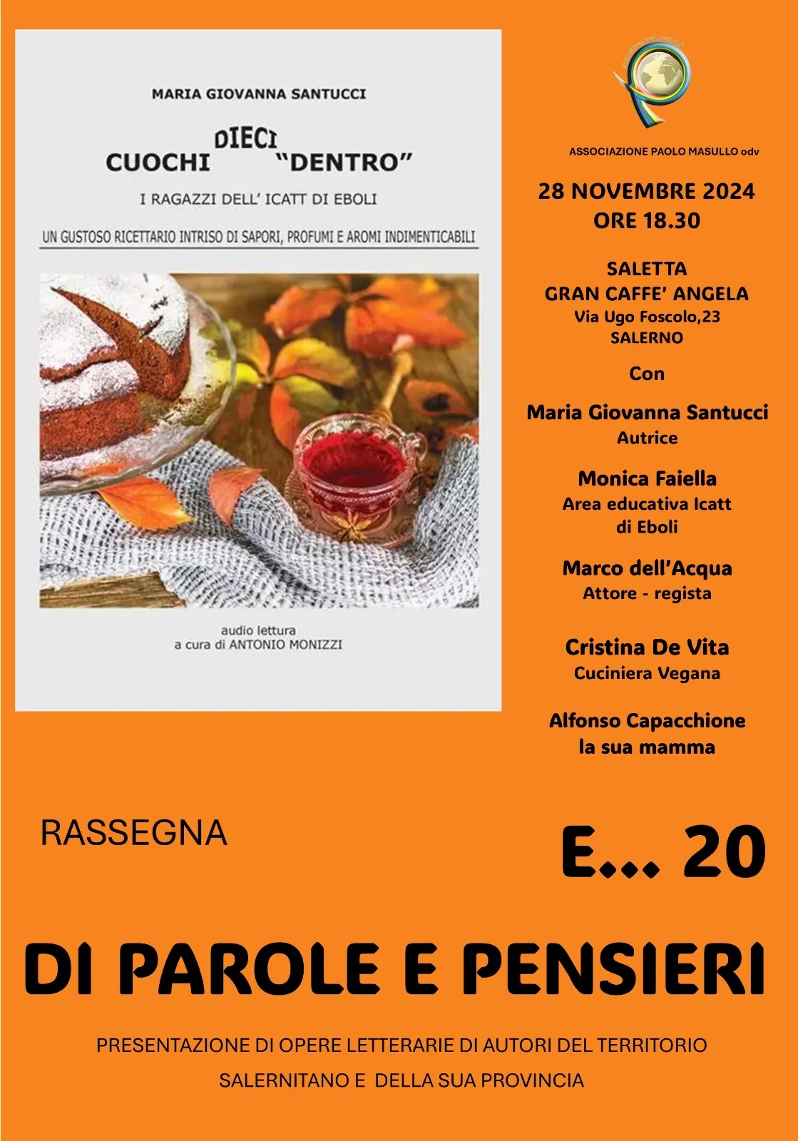 Giovedì 28 novembre alle ore 18:30 presso la saletta del Gran Caffè Angela, ci sarà la presentazione del libro di Maria Giovanna Santucci: Cuochi dieci “dentro”, un ricettario creato con i ragazzi dell’ ICATT di Eboli.