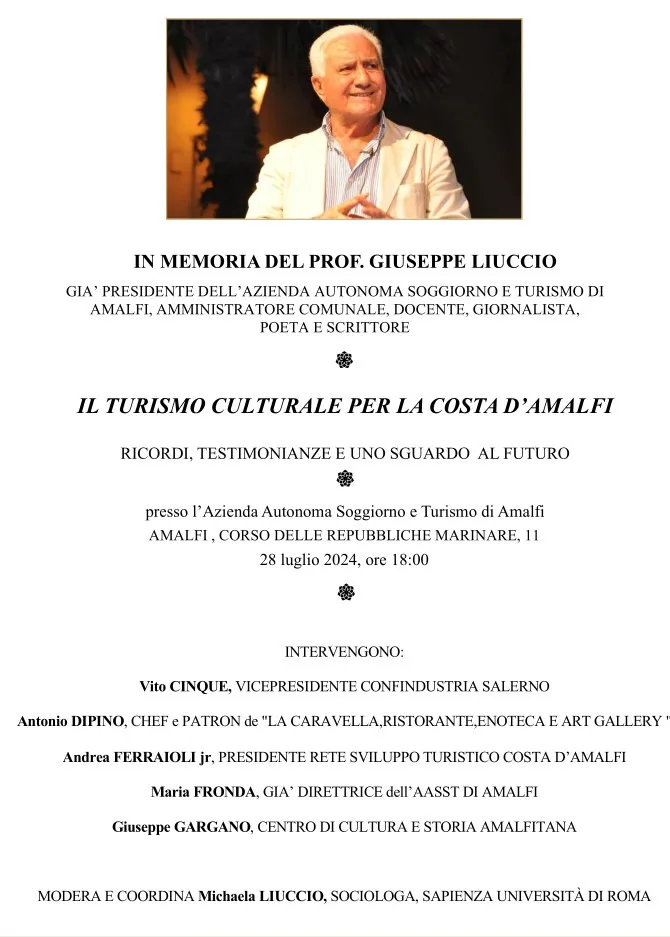 A un anno dalla scomparsa del professore Giuseppe Liuccio, in sua memoria il 28 luglio 2024, alle ore 18:00, presso l’Azienda Autonoma Soggiorno e Turismo di Amalfi, si terrà l’incontro: “Il turismo culturale per la costa d’Amalfi: ricordi, testimonianze e uno sguardo al futuro”. Giuseppe Liuccio, già Presidente dell’Azienda Autonoma di Soggiorno e Turismo di Amalfi, amministratore comunale, docente, giornalista, poeta e scrittore, ha fatto del turismo culturale un tema caratterizzante del suo impegno professionale, politico e sociale. Una promozione turistica strettamente legata alla cultura di un territorio, che rifugge dalla massificazione e dall’omologazione, per andare invece a ritrovare un’identità caratterizzante fatta di storia, arte, letteratura, enogastronomia, artigianato, architettura, religione e leggende. All’incontro parteciperanno: Vito Cinque, Vice Presidente Confindustria Salerno, *Antonio Dipino, chef e patron de “La Caravella, ristorante, enoteca e art gallery “, Andrea Ferraioli jr, presidente Rete Sviluppo Turistico Costa d’Amalfi, Maria Fronda, già direttrice dell’AASST di Amalfi, Giuseppe Gargano, Centro di Cultura e Storia Amalfitana. Modera e coordina Michaela Liuccio, sociologa, Sapienza Università di Roma. Uno spazio sarà lasciato per interventi liberi. L’occasione nasce con l’obiettivo di recuperare, attraverso i ricordi e le testimonianze, l’impegno di Giuseppe Liuccio per la diffusione del turismo culturale, con uno sguardo rivolto al futuro attraverso la voce di chi oggi continua a farsene promotore. Sarà il primo di vari incontri previsti in memoria di Giuseppe Liuccio. Il prossimo si terrà il 22 agosto a Trentinara, suo paese d’origine. Un percorso itinerante per promuovere la nascita dell’Associazione a suo nome: “Da costa a costa: Giuseppe Liuccio”.