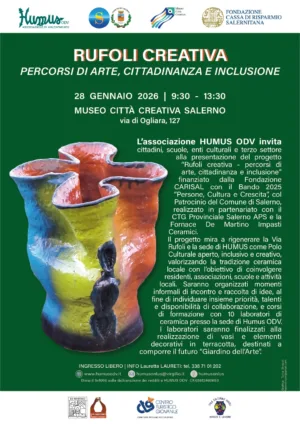 Mercoledì 28 gennaio dalle ore 9:30 fino alle ore 13:30 presso il Museo Città Creativa Salerno (Via di Ogliara 127) ci sarà Rufoli Creativa, un percorso di Arte, cittadinanza e inclusione organizzata dall’associazione HUMUS ODV.