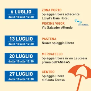 A partire Domenica 6 luglio e per tutte le domeniche fino al 24 agosto ci sarà l’iniziativa di sensibilizzazione promossa dal Comune di Salerno in collaborazione con Salerno Pulita “Una domenica differente…. in spiaggia”. L’obiettivo è promuovere la raccolta differenziata e l’inclusione sociale in modo leggero e spensierato, attraverso attività di animazione gratuite direttamente sulle spiagge di Salerno.
