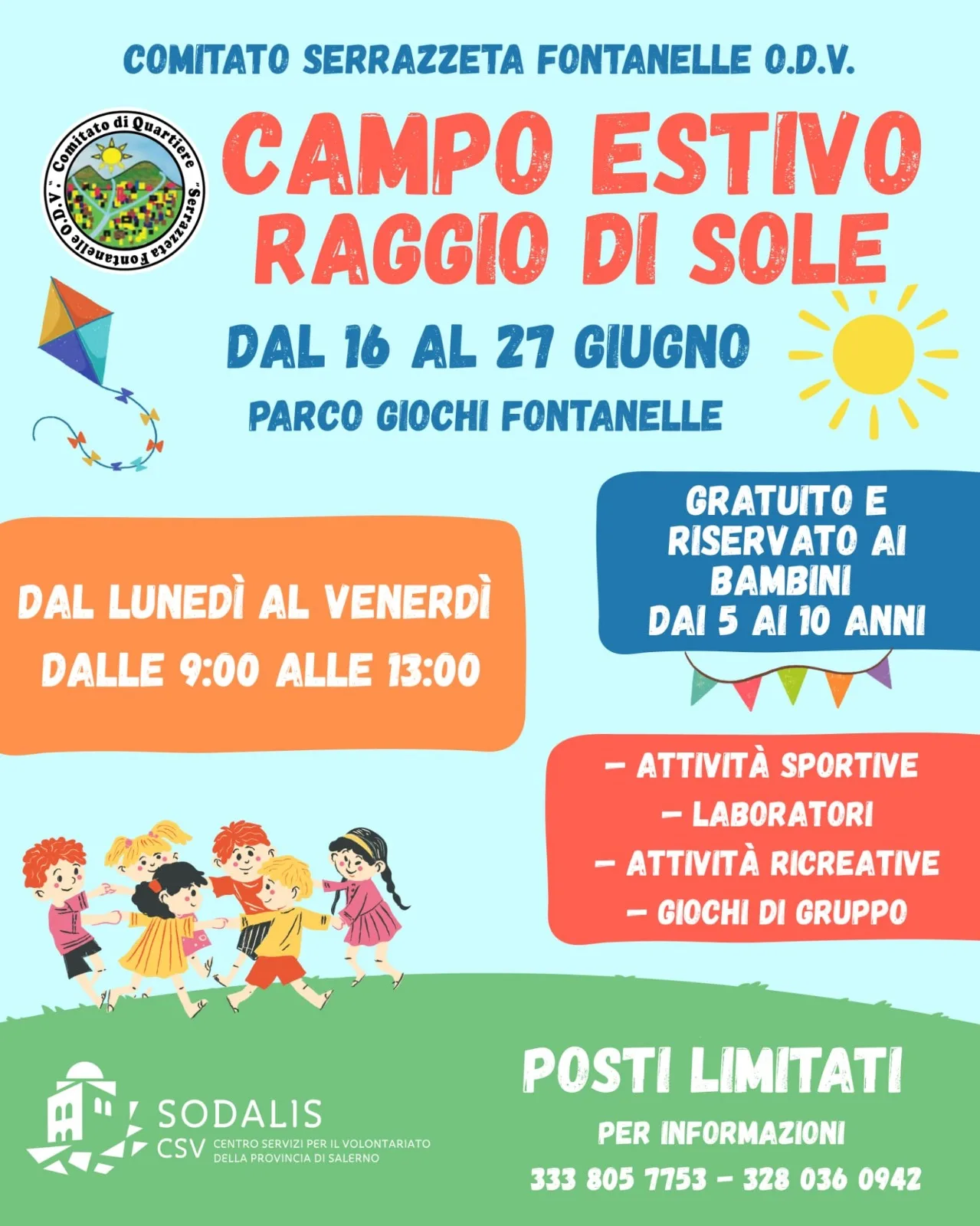 Dal 16 al 27, dal lunedì al venerdì dalle ore 9 alle ore 13 sarà possibile partecipare al Campo Estivo Raggio di Sole, dedicato ad un massimo di 20 bambini.