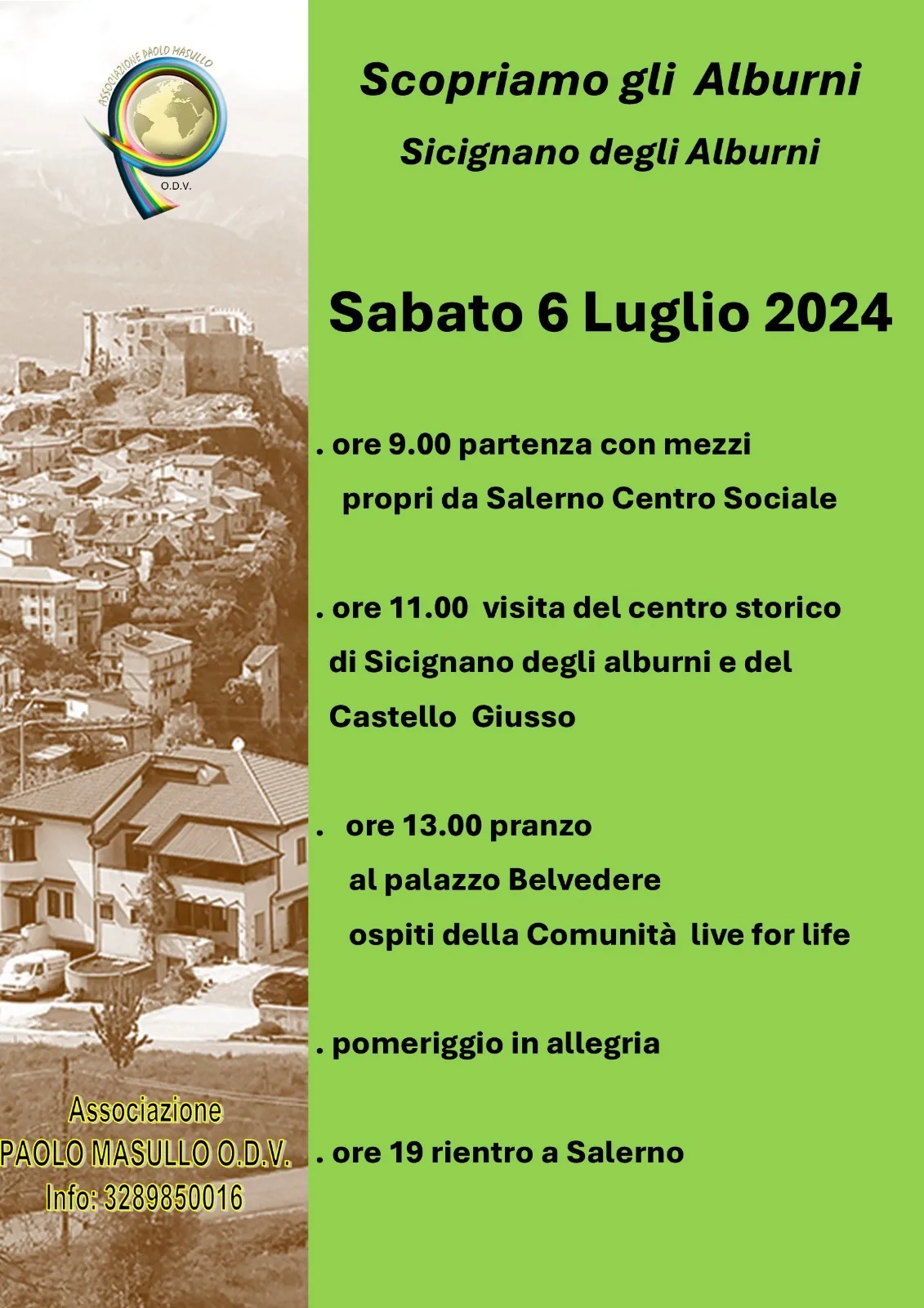 Iniziativa Sabato prossima, l’associazione Paolo Masullo organizza una giornata alla scoperta del centro storico di Sicignano e del castello Giusso, con un pranzo al palazzo Belvedere, ospitati dalla Comunità Live for Life.