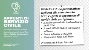 Venerdì 10 aprile 2026, dalle ore 10:00 alle ore 11:30, ci sarà il secondo webinar del ciclo Appunti di Servizio Civile che metterà al centro i dati che emergono dai programmi e dai progetti presentati dagli enti entro il 29 luglio 2025. Il contesto in cui si inserisce il secondo appuntamento è di straordinaria rilevanza. Presso la Commissione Affari Sociali della Camera è in corso l’esame del disegno di legge AC 2825 in materia di giovani e Servizio Civile Universale.