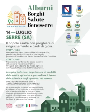 Serre omaggia le antiche tradizioni contadine e l’agricoltura con eventi religiosi, visite guidate presso chiese e monumenti storici, percorso enogastronomico e mostre di artigianato locale e spettacoli. È quanto prevede il programma che si svolgerà domenica 14 luglio, a partire dalle ore 19 a Serre, finanziato dal progetto “Alburni Borghi, Salute e Benessere”. Un progetto di valorizzazione del territorio e della sua storia, promosso da Scabec e dal Ministero del Turismo che vede come Ente capofila il Comune di Postiglione, e come Enti coinvolti i Comuni Palomonte, Serre, Controne e Sicignano degli Alburni, destinatari di un finanziamento della Regione Campania.