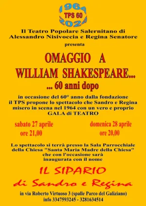 I giorni sabato 27 aprile alle ore 21:00 e domenica 28 aprile alle ore 20:00, presso la Sala Parrocchiale della Chiesa ‘Santa Maria Madre della Chiesa’, il Teatro Popolare Salernitano torna in scena con un omaggio a Sandro Nisivoccia e Regina Senatore con lo spettacolo “Omaggio a William Shakespeare…60 anni dopo”. In occasione dello spettacolo la sala che lo ospità sarà inaugurata con il nome “il sipario” di Sandra e Regina.