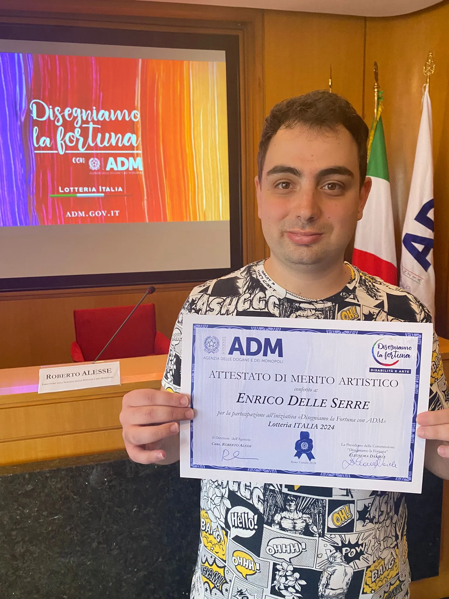L’opera del giovane artista salernitano, 26 anni, è stata selezionata tra i dodici disegni che verranno utilizzati nei biglietti della Lotteria Italia 2024, nell’ambito dell’iniziativa “Disegniamo la fortuna con ADM”, il concorso promosso dall’Agenzia delle Dogane e dei Monopoli dedicato agli artisti con disabilità che hanno visto le loro opere valutate da una giuria d’eccezione e che saranno rappresentate sui biglietti della Lotteria Italia.