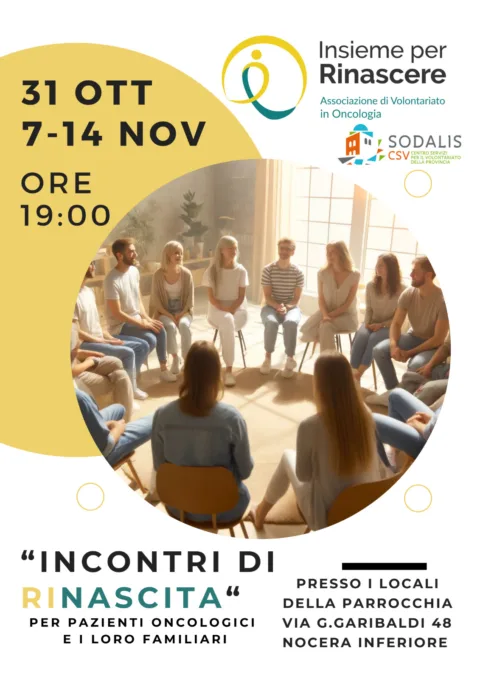 Uncategorized OLTRE IL CANCRO: INCONTRI DI RINASCITA Dopo l’incontro del 31 ottobre ritorna, il 7 e il 14 novembre dalle ore 19:00, presso la parrocchia in via Garibaldi 48 di Nocera Inferiore, Incontri di Rinascita, evento Elpis Social TV1 anno faContinua a Leggere