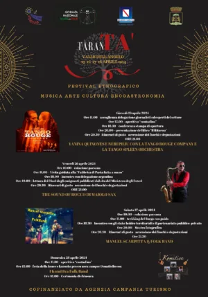 Parte domani, giovedì 25 aprile, il festival etnografico, musica, arte, cultura enogastronomia “Tarantà”. Ricco il programma della quattro giorni che si chiuderà domenica prossima. Prevista la presenza di esperti del settore e di una delegazione Argentina. Nell’ultimo giorno dell’evento, presso l’Area Sosta Camper Donatiello, a Valle dell’Angelo, prevista anche un’intera giornata dedicata agli ai camperisti. È prevista la sosta gratuita, ma la prenotazione è obbligatoria chiamando il numero 0974 275935. Le finalità e gli obiettivi di TaranTà sono: valorizzazione di prodotti tipici campani, destagionalizzazione dei flussi turistici, creazione di un’offerta turistica basata su modelli esperienziali e sensoriali, integrare la proposta con iniziative e progetti già esistenti sul territorio.