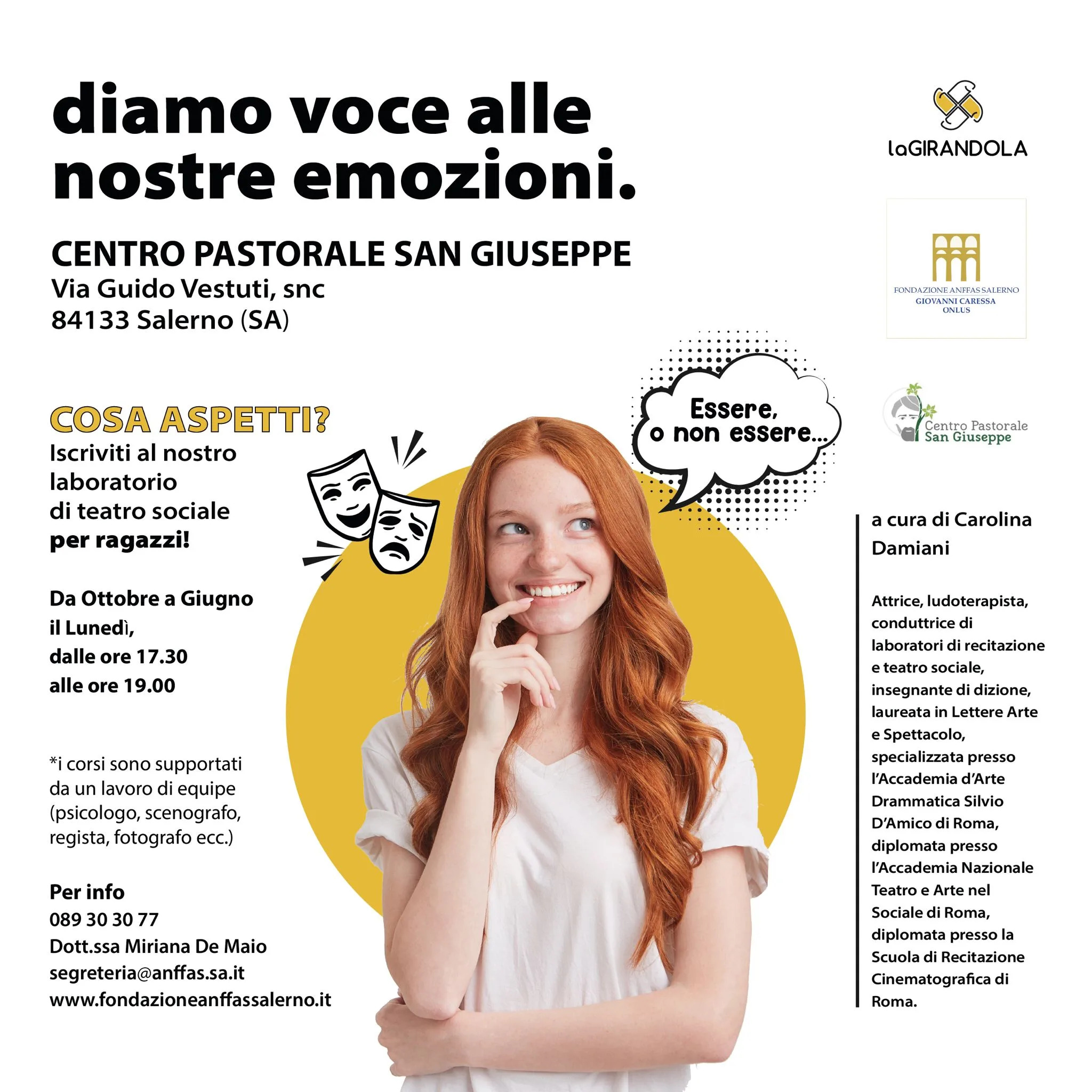 A partire da lunedì 21 ottobre sarà il Centro Pastorale San Giuseppe in Via Guido Vestuti, al quartiere Italia di Salerno ad ospitare, settimanalmente tutti i lunedì dalle ore 17.30 alle 19.00, le attività, dove grazie al teatro andrà in scena senza limiti un universo di fantasia. Il corso del Laboratorio Teatrale “La Girandola” sarà come sempre a cura di Carolina Damiani, regista e operatrice in Teatro Sociale, che realizza spettacoli insieme a persone con e senza disabilità, supportati da un'equipe multiprofessionale composta da psicologo, scenografo e fotografo.