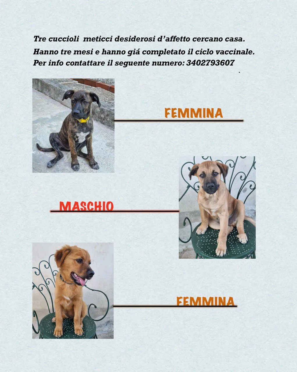 Tre cagnolini meticci di tre mesi d’età sono in attesa d’adozione. Di futura taglia media vengono descritti come socievoli e vivaci. Hanno il microchip e tutte le vaccinazioni ed aspettano umani affidabili. Per informazioni si può contattare il numero 340 27 93 607