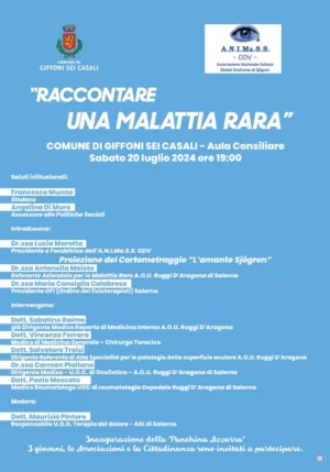 Sabato 20 luglio 2024, presso l’Aula Consiliare di Giffoni Sei Casali, si terrà un convegno dal titolo: “Raccontare una malattia rara” organizzato dal Comune in collaborazione con l’Associazione A.N.I.Ma.S.S. (Associazione Nazionale Italiana Malati Sindrome di Sjögren).