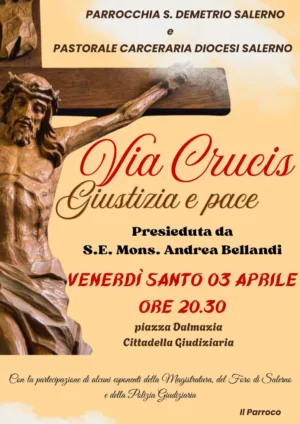 Saranno presenti esponenti del Tribunale di Salerno, magistrati, avvocati, direttori di istituti penitenziari, detenuti e volontari della Pastorale Carceraria: testimonianze vive di un cammino che cerca ogni giorno di coniugare giustizia e misericordia. “La Via Crucis diventa così non solo memoria del dolore, ma anche invito a costruire una società più giusta e pacifica, dove nessuno sia escluso e ogni vita sia riconosciuta nella sua dignità- ha concluso il Parroco di San Demetrio, nonché Direttore della Pastorale Carceraria, Don Rosario Petrone- Un’occasione per fermarsi, riflettere e pregare insieme, affinché giustizia e pace possano davvero camminare unite nelle nostre città e nei nostri cuori”.