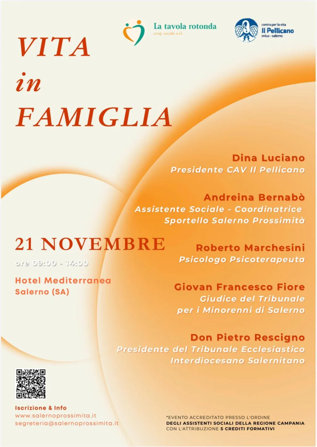 Organizzato dal Centro per la VITA “Il Pellicano” e dalla Coop. Sociale “La Tavola Rotonda”, l’evento è accreditato presso l’Ordine degli Assistenti Sociali della Regione Campania e riconosce 5 crediti formativi.